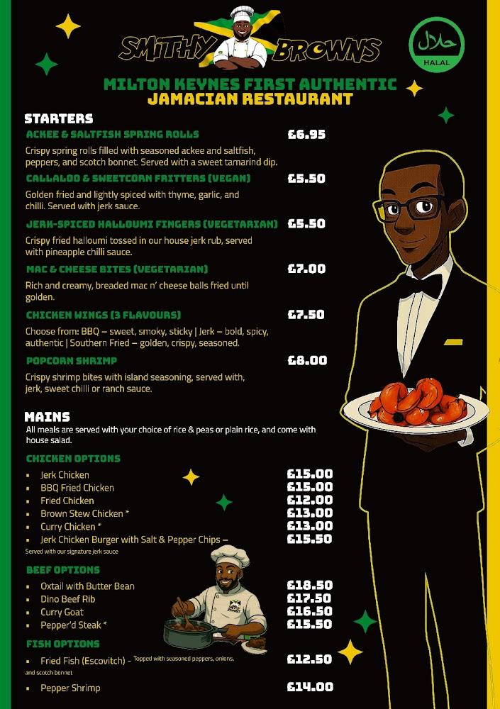 Nestled in Unit 2a of Stephenson House in Bletchley, Smithy Browns has quickly established itself as a beloved Jamaican restaurant in Milton Keynes. With its accessibility and a welcoming approach, this vibrant eatery caters to everyone, offering wheelchair-accessible seating and amenities for families. The casual atmosphere invites diners to unwind, whether they're enjoying a lively meal with friends or a quiet dinner alone. The lively decor reflects Jamaica's colorful spirit, and the rhythmic reggae music enhances the overall experience, making it impossible not to feel at home. Smithy Browns stands as a culinary gem in a thriving community, promising a blend of culture and flavor that leaves patrons coming back for more.